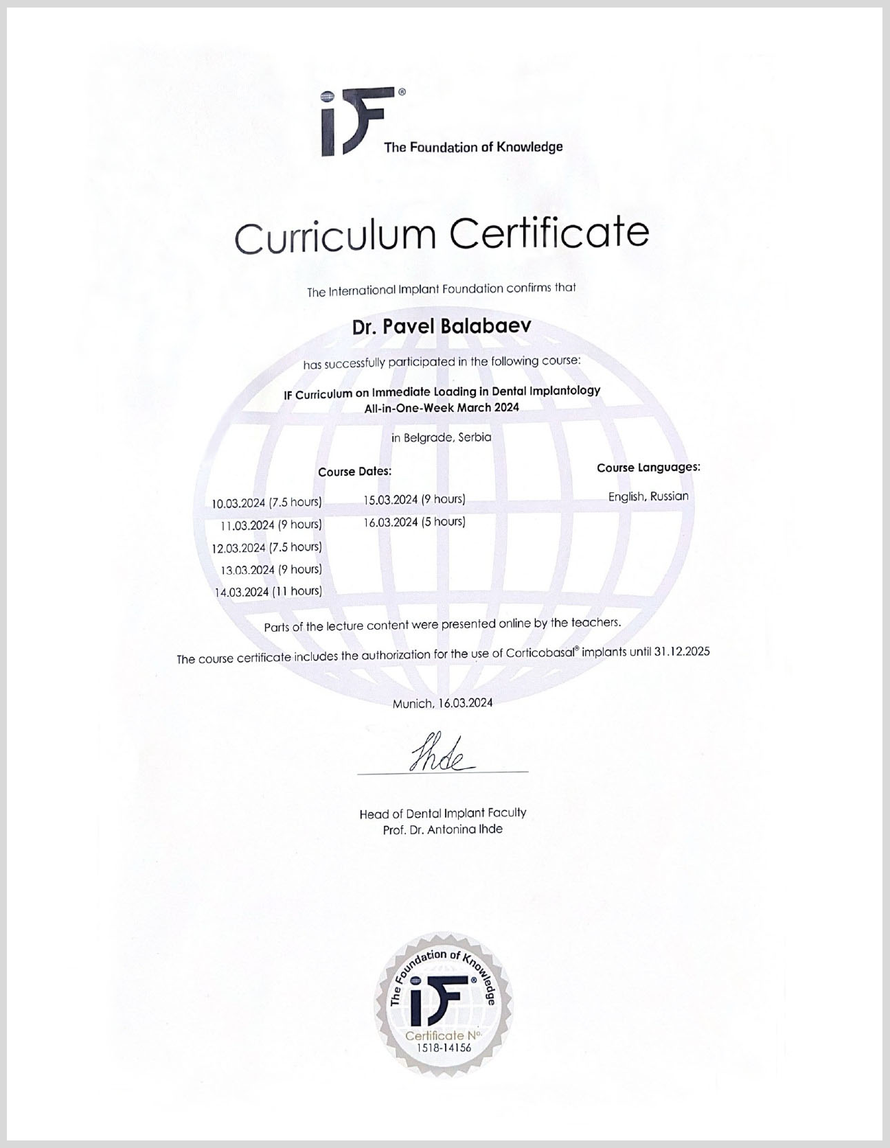 - тотальное восстановление зубочелюстной системы методом стратегической кортико-базальной имплантации, «All-in-oneweek», prof. dr. Stefan Ihde, 2024 г., Белград.