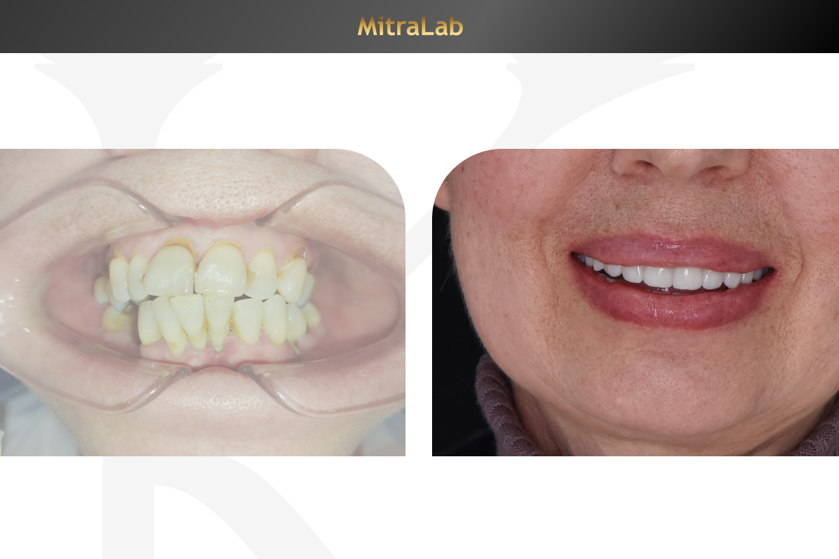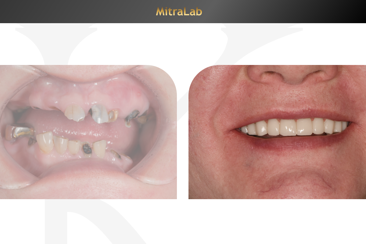 Пациентка преподаватель, часто проводит лекции и семинары, поэтому для нее важны правильная дикция и красота улыбки. Обратилась в клинику МитраЛаб для полного восстановления обеих челюстей.