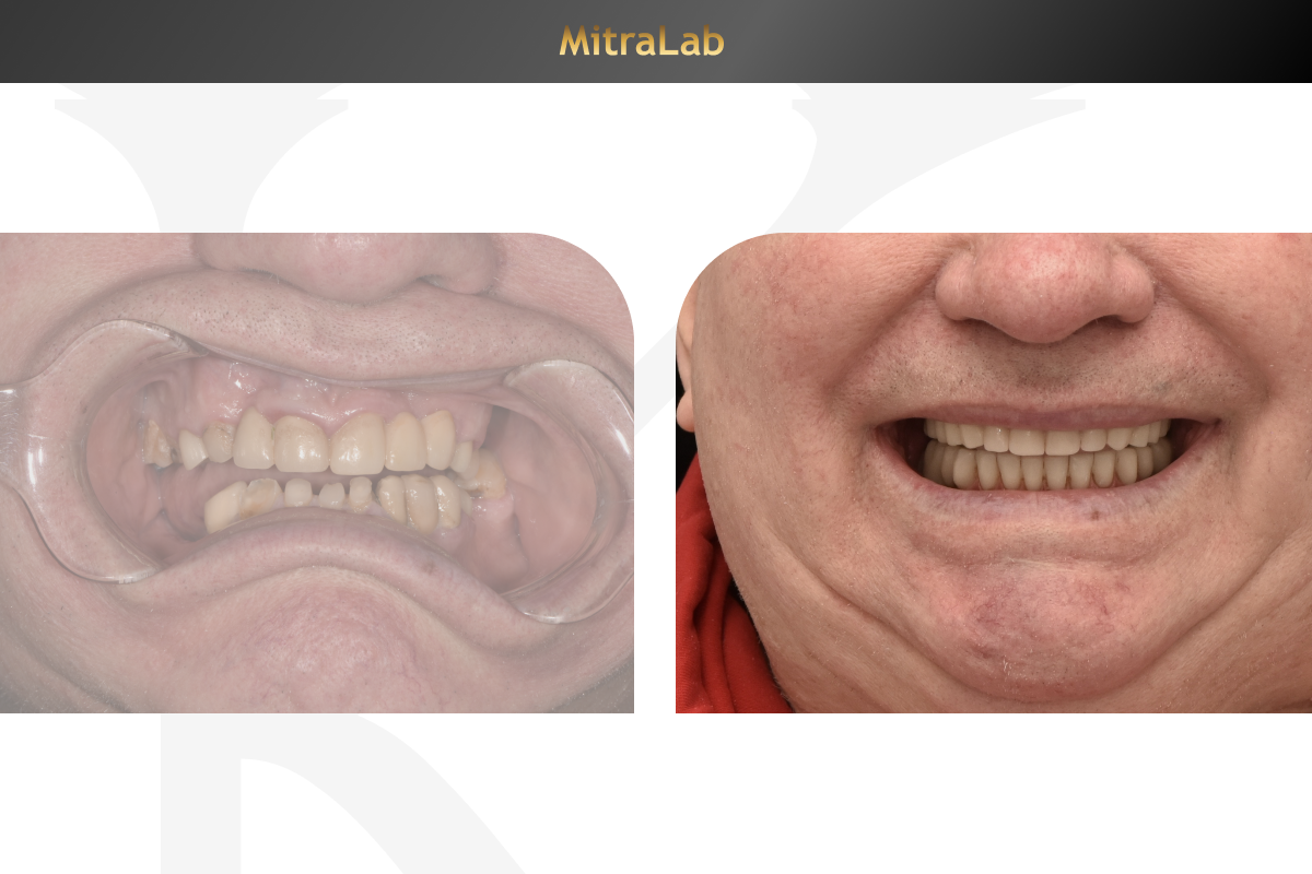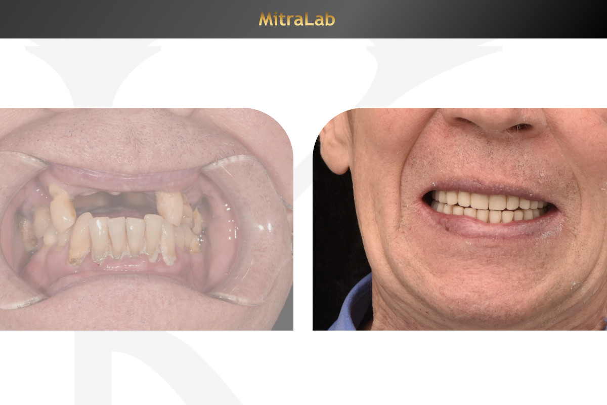 В МитраЛаб пациент получил комплексное решение проблемы: разрушенные зубы удалены, установлены швейцарские имплантаты Oneway Biomed и зубы из ПММА на обеих челюстях.