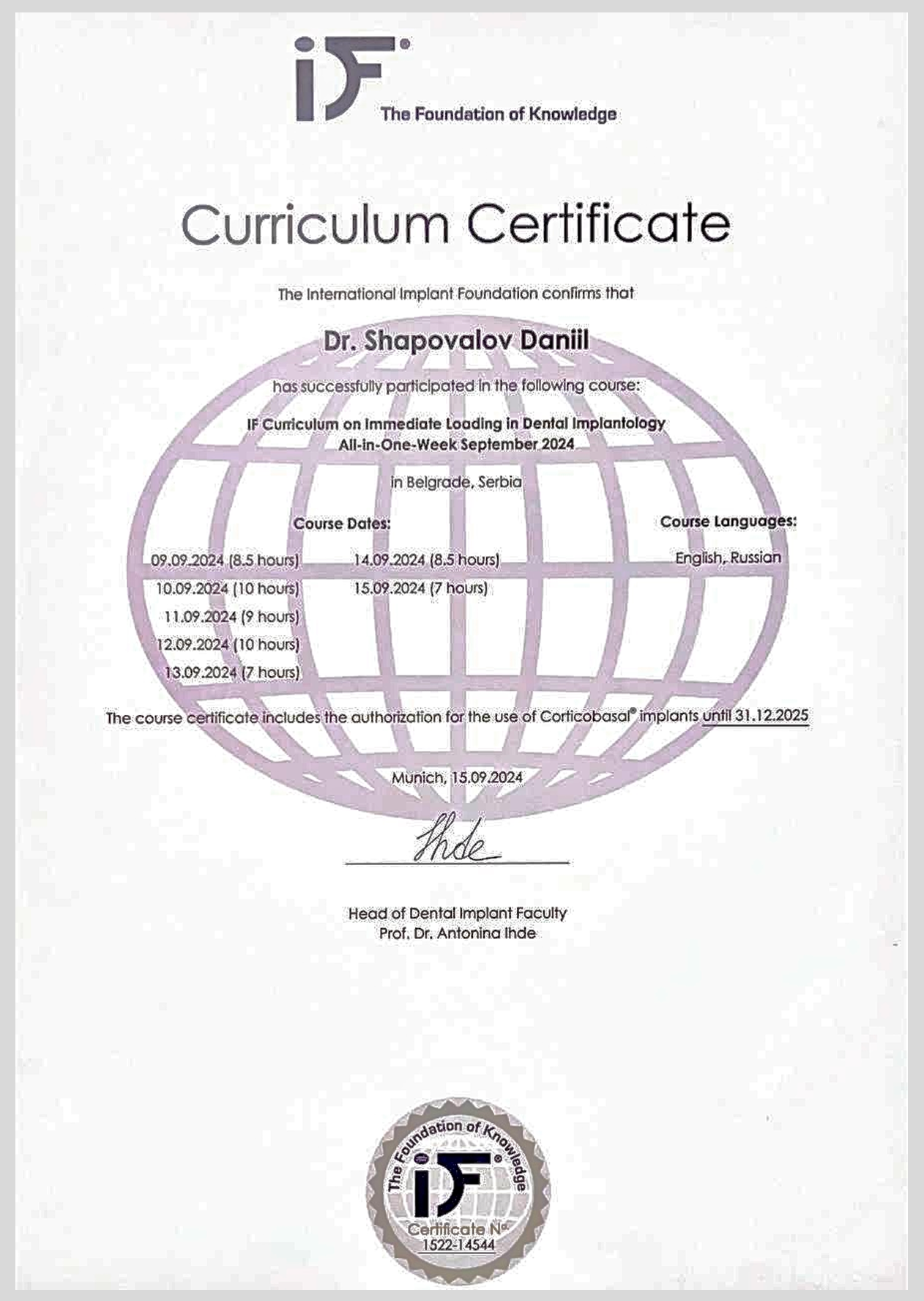 - ФМБА России, специальность — стоматолог-ортопед, 2021-2023 гг.